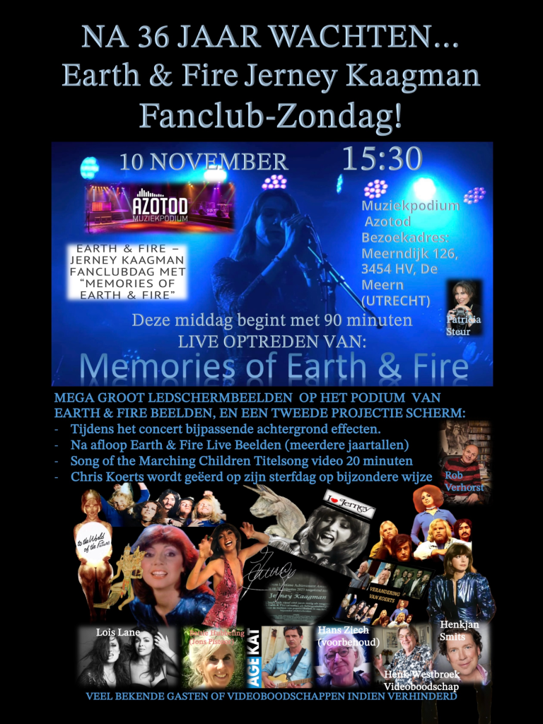 🎈🎈🎈🌎🔥❤️ NA 36 JAAR WACHTEN… EARTH & FIRE JERNEY KAAGMAN FANCLUBDAG met een fantastisch optreden van top tribute band “Memories of Earth & Fire” is een nostalgisch feit; met een fantastisch uniek programma dat nooit eerder is gedaan: