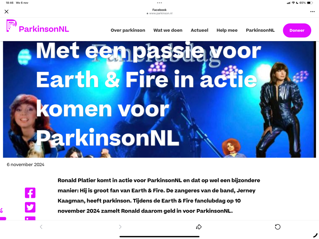 Dit is het artikel dat gepromoot wordt: https://www.parkinson.nl/actie/met-een-passie-voor-earth-fire-in-actie-komen-voor-parkinsonnl/