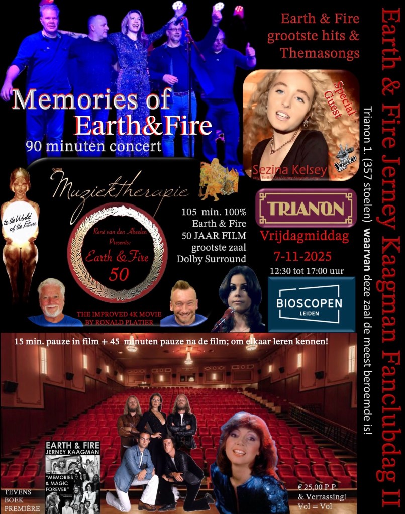 Op 7 november 2025 vindt in de grootste en mooiste bioscoop van Leiden een unieke en eenmalige non-profit vertoning plaats ter ere van 57 jaar Earth & Fire. Deze bijzondere gelegenheid biedt fans een uitgebreide ervaring: zie hier de trailer: https://youtu.be/d_FZPqO8dJI?si=xgslBLm8gdGZhFrd
